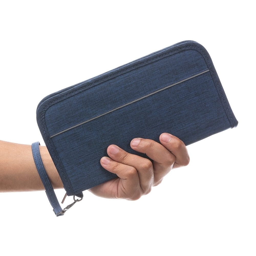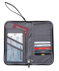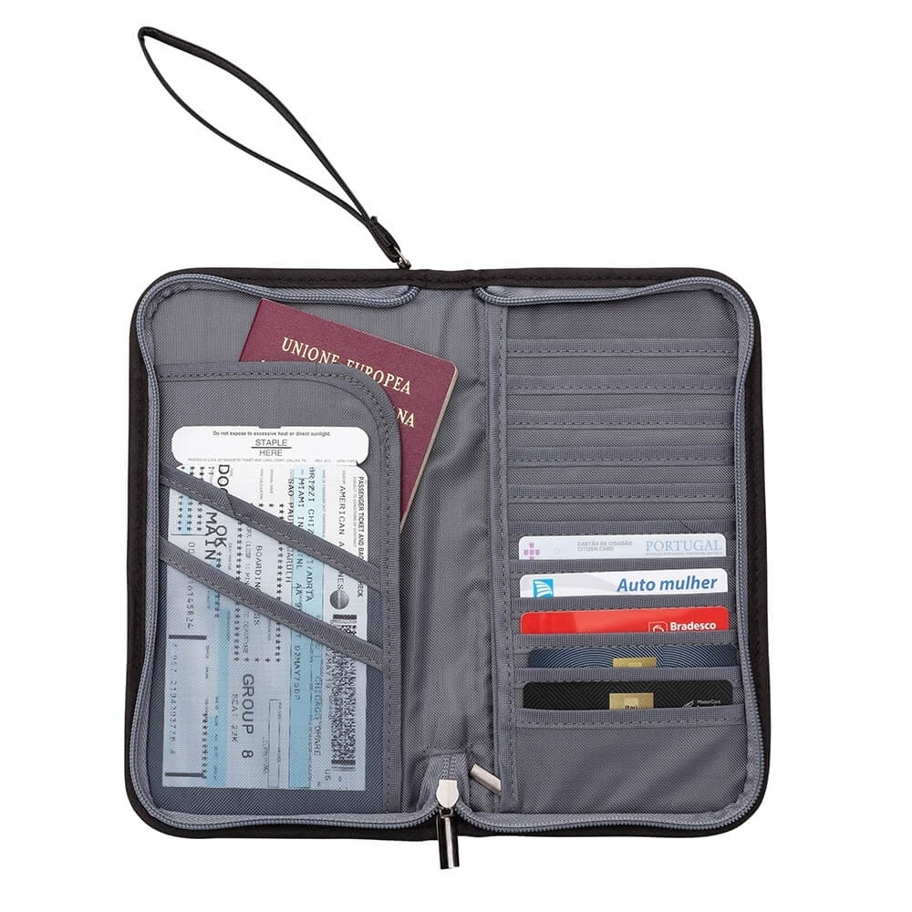 Descrição: Carteira de nylon impermeável com alça de mosquetão. Com amplo espaço, possui onze divisórias para cartões e bolso no verso, compartimento com zíper e bolso aberto com duas divisórias com tela para documentos; parte externa com bolso para celular.