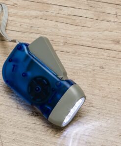 Descrição: Lanterna plástica com 3 leds, pressionando o “gatilho” gera energia para alimentar a lanterna dínamo. Possui botão para ligar/desligar lanterna, botão para travar gatilho e acompanha cordão.