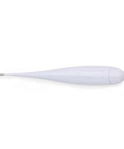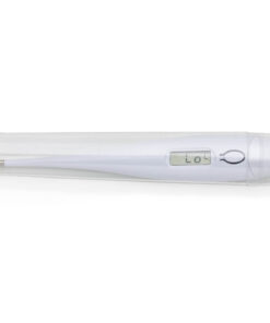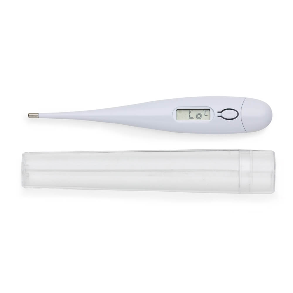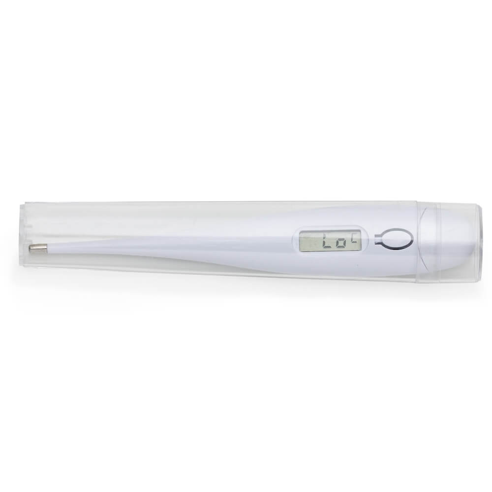 Descrição: Termômetro branco digital, possui display e botão ao lado para ligar/desligar e parte traseira relevo quadrado para aplicar logo. Tampa na lateral pode ser removida para trocar bateria(acompanha uma LR41) e embalagem acrílica.